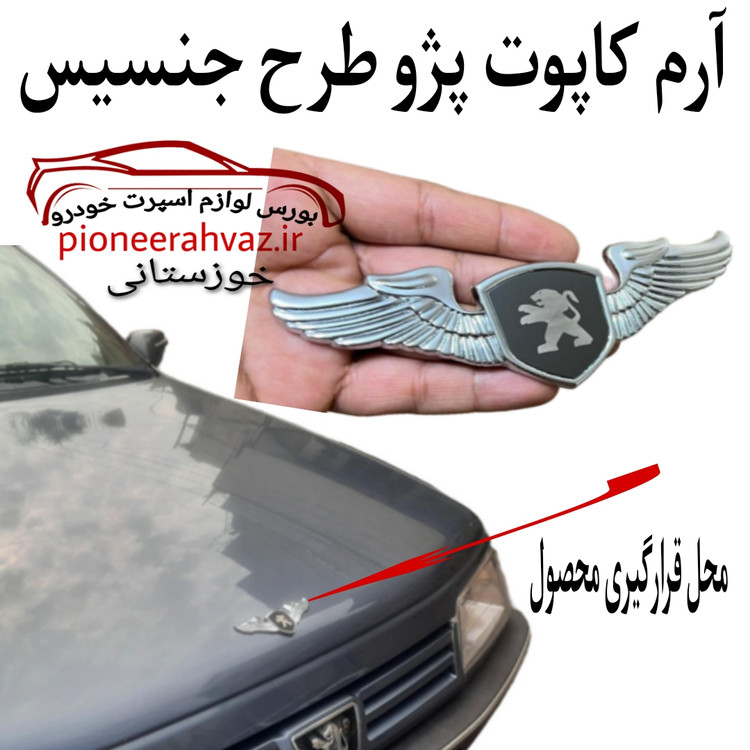 آرم فلزی کاپوت پژو طرح جنسیس: آرم فلزی بال دار پژو ابعاد: ۱۱ سانتی متر * ۴.۵ سانتی متر فلزی چسب دار با روکش کروم ضد زنگ و ضد رنگ پریدگی