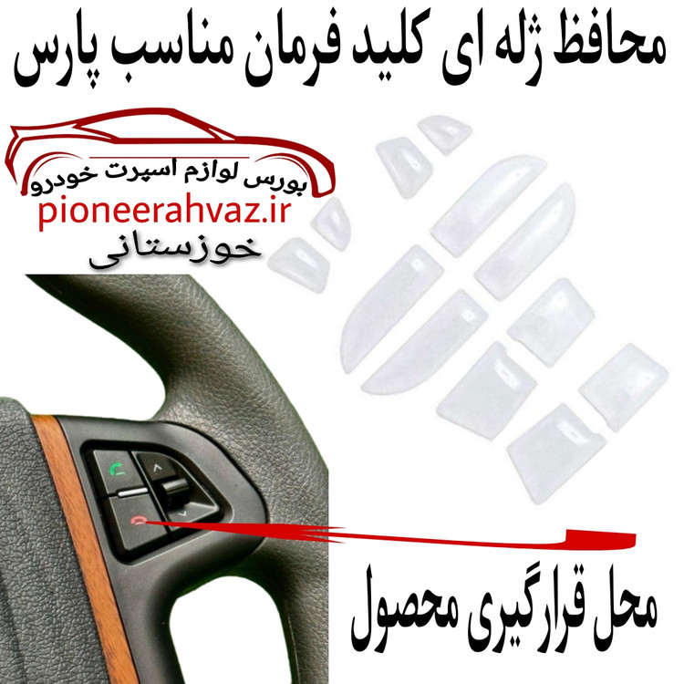 محافظ ژله ای دکمه های فرمان مناسب پارس: محافظ دکمه فرمان مانع از پاک شدن طرح دکمه های فرمان می شود. جنس این محصول ژله ای می باشد مخصوص خودرو هایی است که فرمان آنها دارای دکمه می باشد