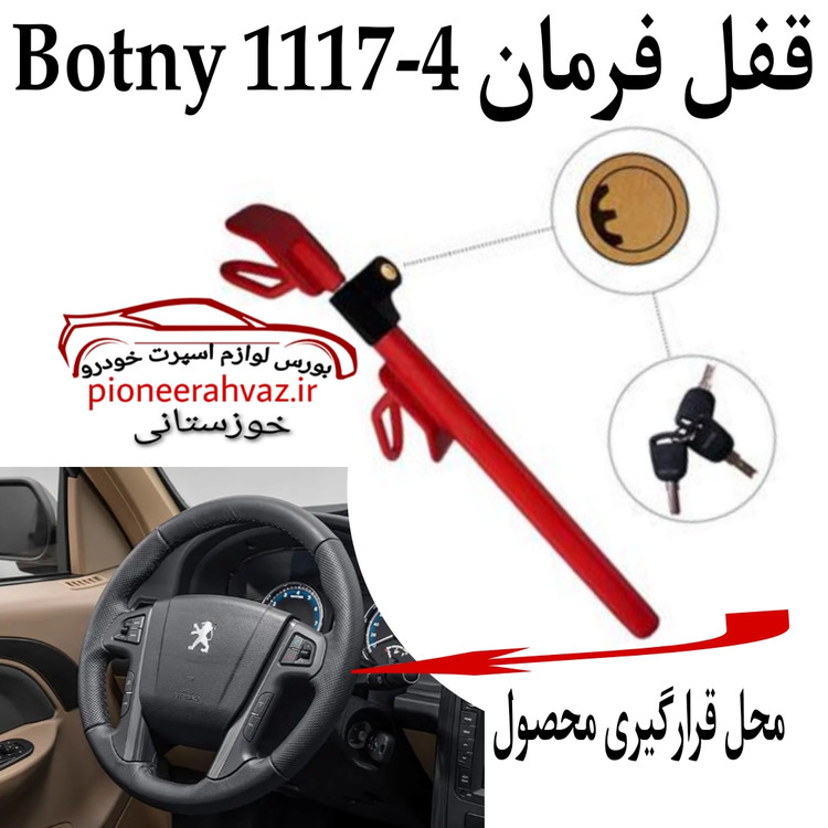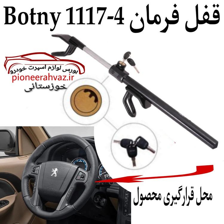 قفل فرمان BOTNY مدل کلاغی 4-1117: عدم چرخش آن روی فرمان مقاوم در برابر برش و خمیدگی بدنه ساخته شده از جنس PVC دارای ۳ عدد کلید تخت میباشد مغزی قفل برنجی با خاصیت ضد زنگ زدگی نوع روکش این قفل از مواد PVC مرغوب است