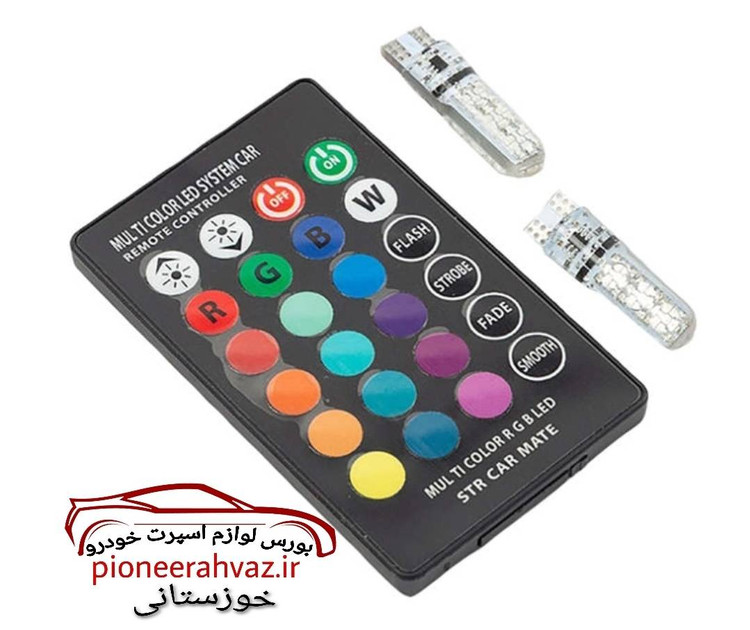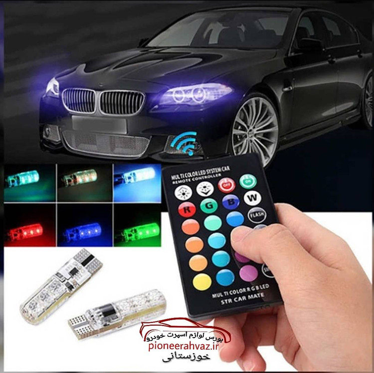 بسته محصول شامل یک جفت لامپ با ریموت کنترل قابل نصب در چراغ کوچک تمام خودروها تغییر رنگ، حالت و سرعت فلش زن به وسیله ریموت