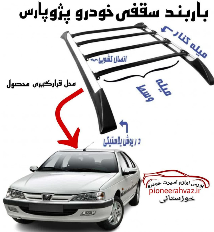 باربند خودرو مناسب برای پژو پارس : ابعاد : ۱۲۵x۲۵x۱۳ سانتیمتر وزن : ۵۰۰۰ گرم ویژگیهای باربند : لوازم و اثاثیه