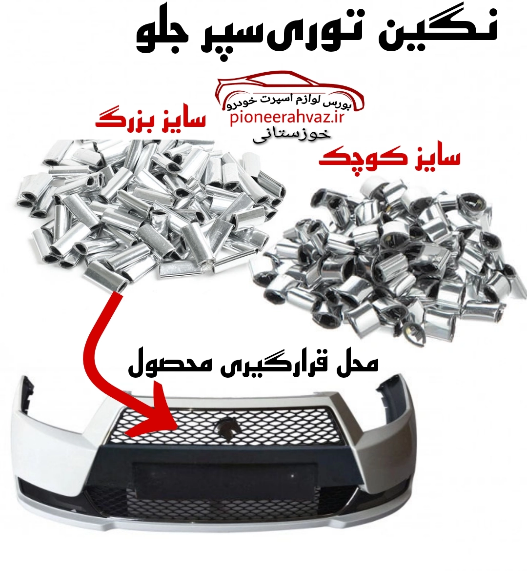این محصول برای جذاب و اسپرت کردن سپر جلو کاربرد دارد که با روکش کروم در داخل توری سپرهای RC 206 و معمولی اکثر خودروها نصب می شود. نگین توری سپر از جنس پلاستیک، همراه با چسب ژله ای در داخل آن بوده و می توان در طرح های مختلفی روی سپر خودروهایی مانند 206، 207، رانا، ال 90، برلیانس و … نصب کرد. برای خودروهایی که طول هر ضلع توری آنها بیشتر است دو یا سه عدد را کنار هم قرار دهید.