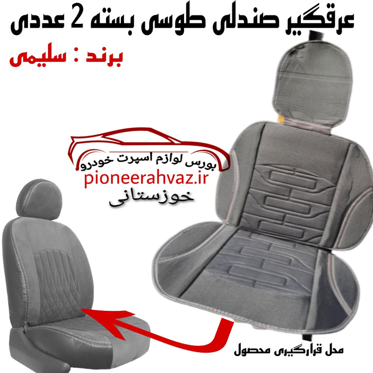 عرقگیر صندلی سلیمی طوسی بسته 2عددی: پارچه اعلا که قابلیت تهویه هوا دارد . دارای گلدوزی دارای لایه موکت در پشت جهت مقاومت بیشتر دارای چند کش با قفل در پشت جهت محکم شدن روی صندلی همراه با سر صندلی . نصب آسان قابل شستشو .