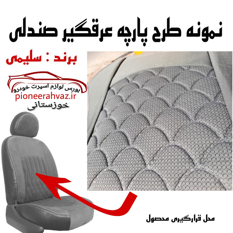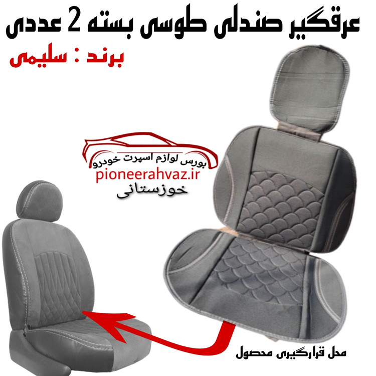 عرقگیر صندلی سلیمی طوسی بسته 2عددی: پارچه اعلا که قابلیت تهویه هوا دارد . دارای گلدوزی دارای لایه موکت در پشت جهت مقاومت بیشتر دارای چند کش با قفل در پشت جهت محکم شدن روی صندلی همراه با سر صندلی . نصب آسان قابل شستشو .